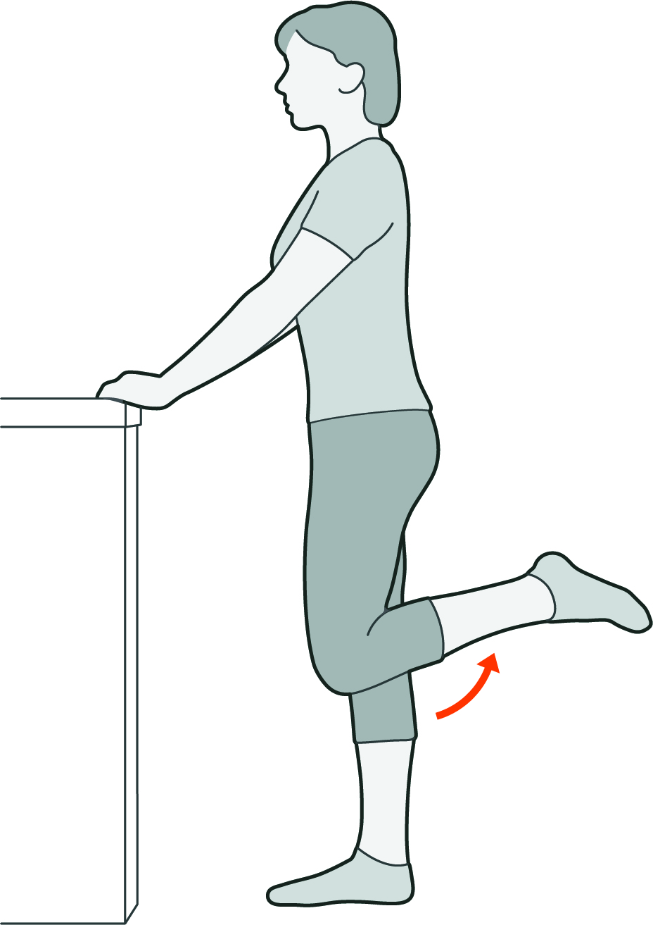 • For hips: Hold onto a work surface and march slowly on the spot bringing your knees up towards your chest alternately. Don’t raise your thigh above 90 degrees. Also, holding on to a surface, bend each knee in turn, putting your heel up towards your bottom with the kneecap pointing towards the floor.