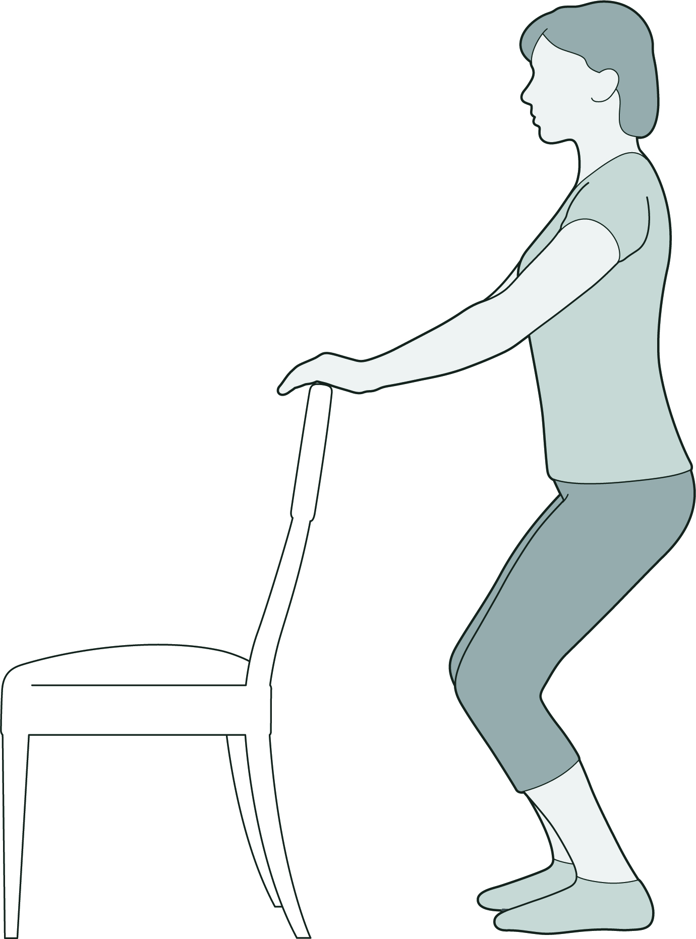 • For knees: sit well back in the chair with good posture. Straighten and raise one leg. Hold for a slow count up to 10, then slowly lower your leg. Similar exercises can be done lying down or standing. If you are unsteady on your feet hold on to a firm surface and do a few squats bending your knees so that they are over your feet, making sure you only do as much as you can.