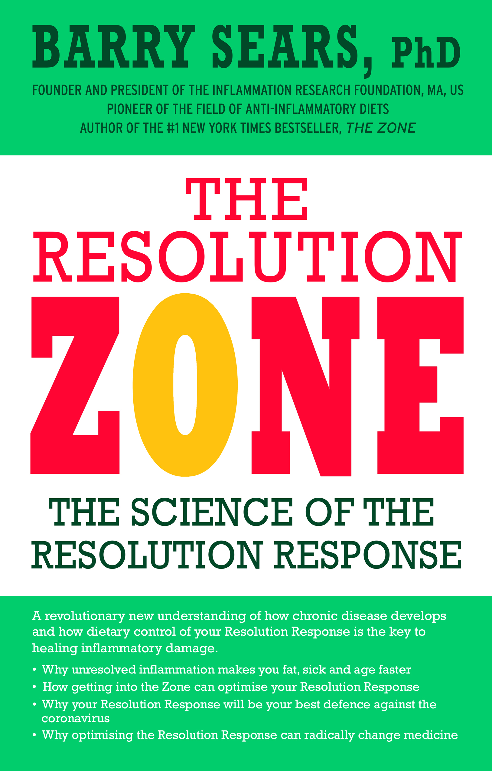 My journey to understanding chronic disease; What is the Zone? Why do you want to be in the Zone? How do you get into the Zone? Overview of the Zone Pro-resolution Nutrition system: a defined dietary pathway to the Zone; How inflammation keeps you alive and the Resolution Response keeps you well; Diet-induced inflammation; Markers of the Zone; Zone diet: reducing diet-induced inflammation; Fermentable fibre: the key to maintaining gut health; Omega-3 fatty acids: agents of resolution; Polyphenols: activators of our genes, guardians of our gut; Personalising the Zone Pro-resolution Nutrition system; Dietary facts and fallacies; Diet wars: comparison of the Zone diet with other diets; Zone protein: making the Zone diet even easier to follow; Zone Pro-resolution Nutrition for pregnancy, childhood and adolescence; Reaching peak sport and exercise performance; Why do we get fat? Why do we get sick? Why do we age? The future of medicine. APPENDICES: Further support; Glossary; Inflammation in detail; Metabolism; Energy-sensing gene transcription factors; AMP kinase and mitochondria; Gut physiology; Using Pro-resolution Nutrition to control viral infections